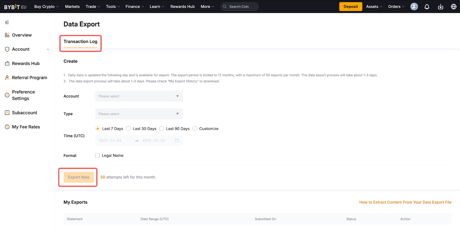 Fase 1: Nella home page di Bybit EU, passa il cursore sul tuo profilo, quindi vai su Account → Esportazione dati.