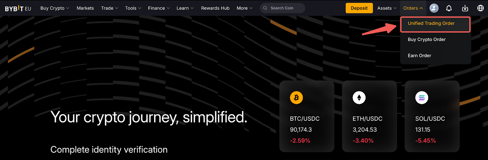 Fase 1: Per esportare i dati cronologici di un particolare prodotto di trading, vai su Ordini → Ordine di trading unificato dalla home page di Bybit EU.