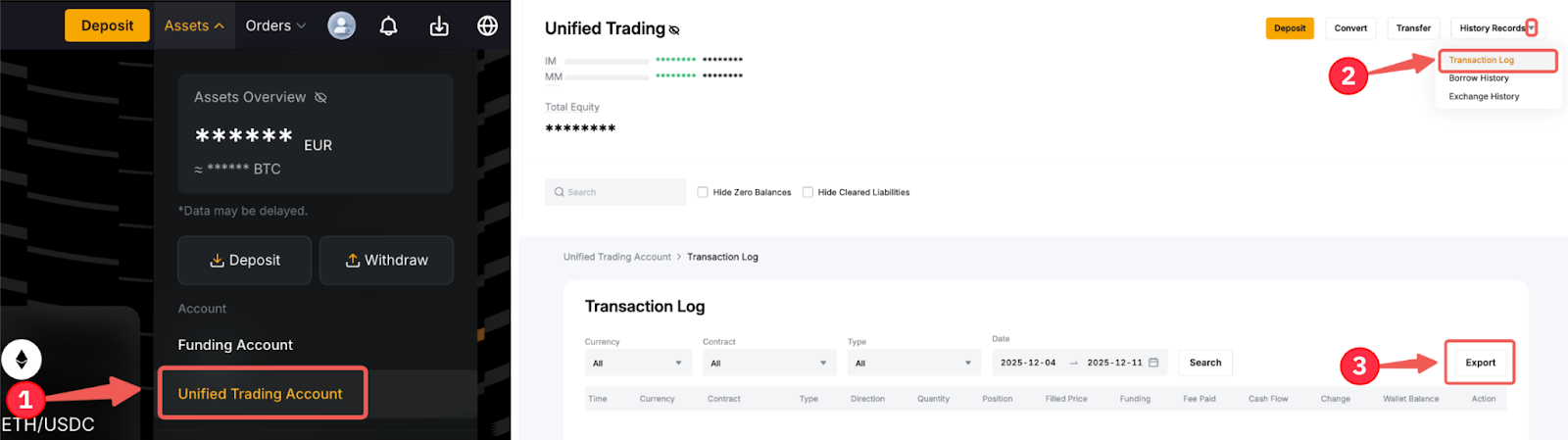 Fase 1: Puoi anche esportare il registro delle transazioni tramite il tuo Conto di trading unificato. Per fare ciò, vai su Risorse → Conto di trading unificato → Registri cronologici → Registro transazioni → Esporta.