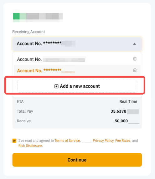 Fase 3: Scegli il conto di ricezione e controlla attentamente i dettagli del pagamento prima di confermare il tuo ordine.