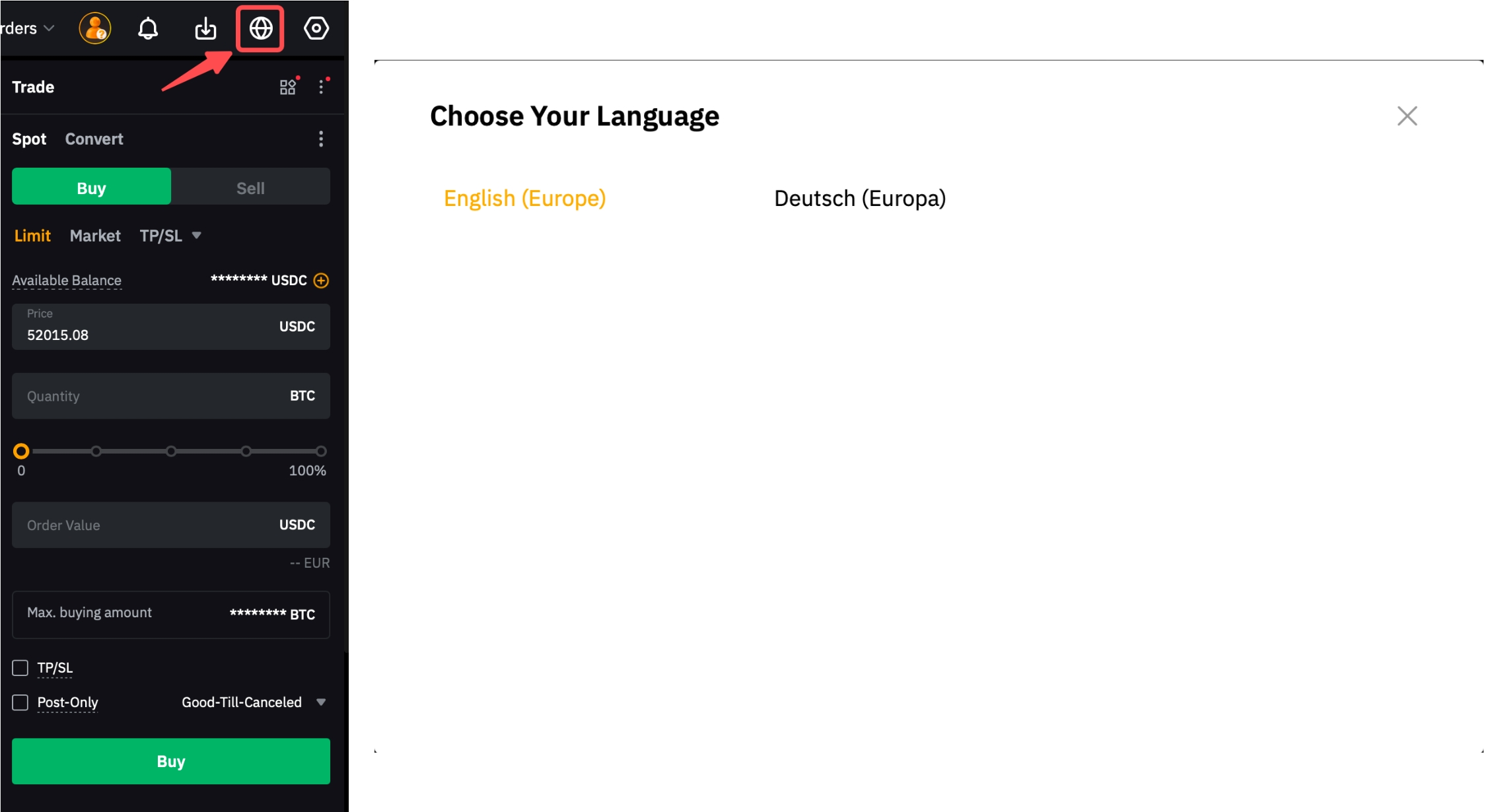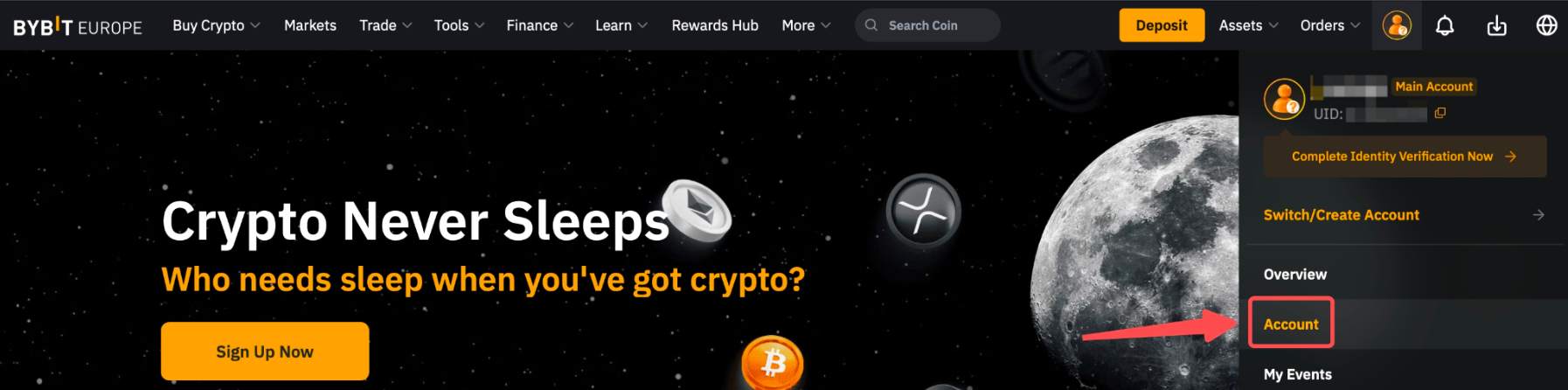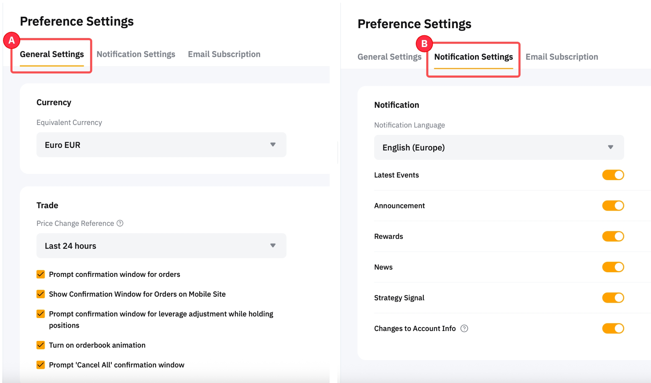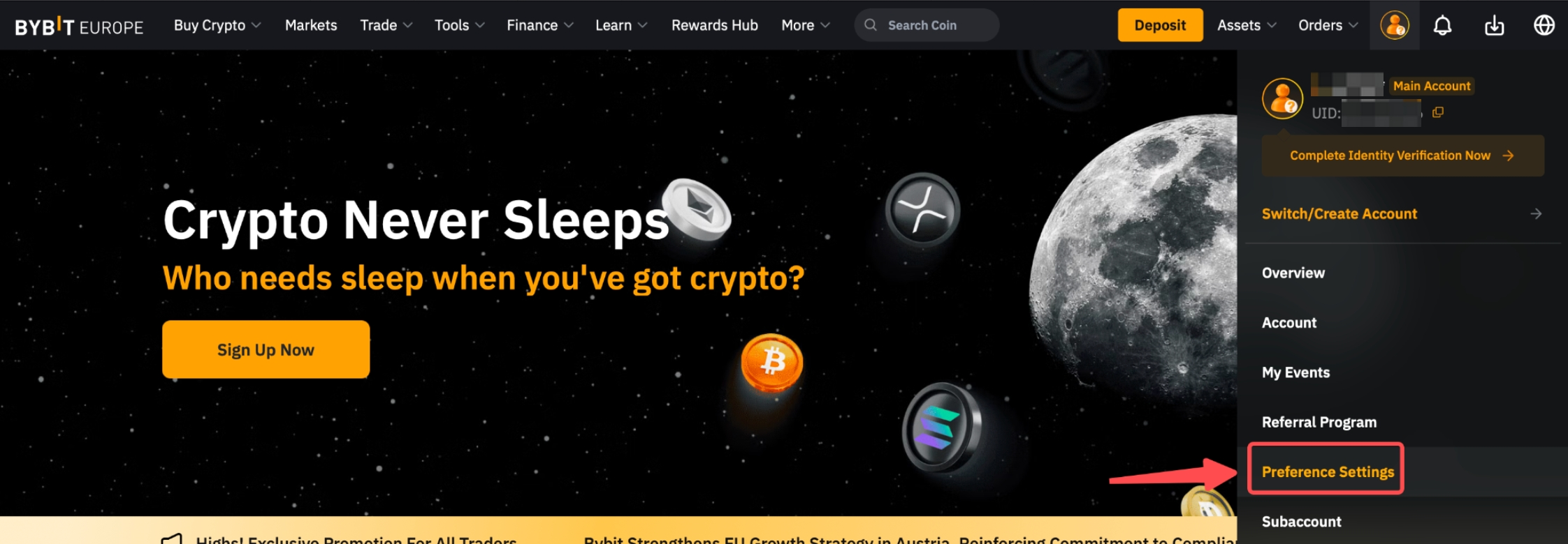 Step 2: Select your preferred currency (A) for display on the Bybit EU website. This currency will be used to give you an estimate of your funds and order amounts to better grasp the value in your account.