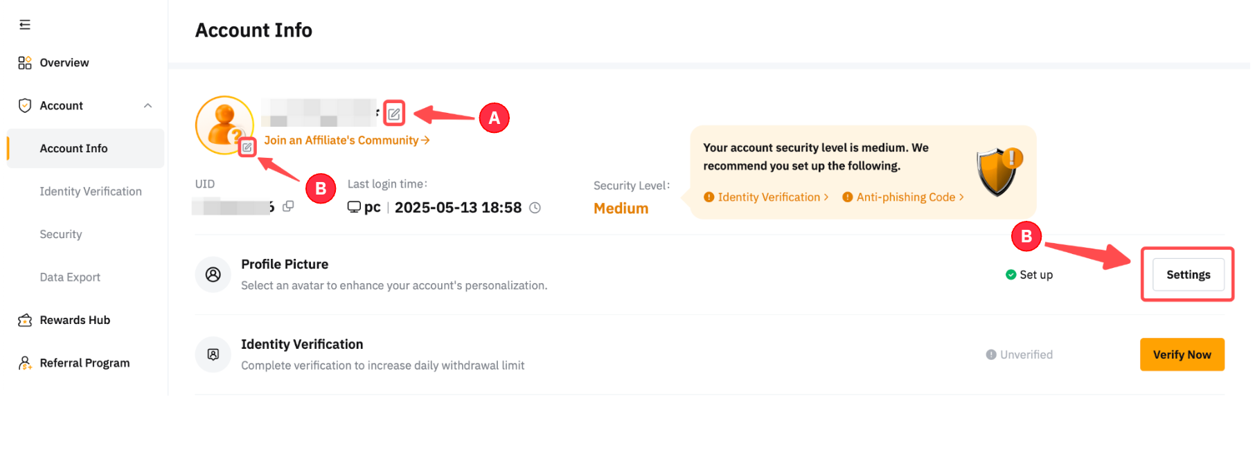 Step 2: To modify your profile nickname, simply click on the edit icon next to your current name (A), enter your new username, and click on Confirm.