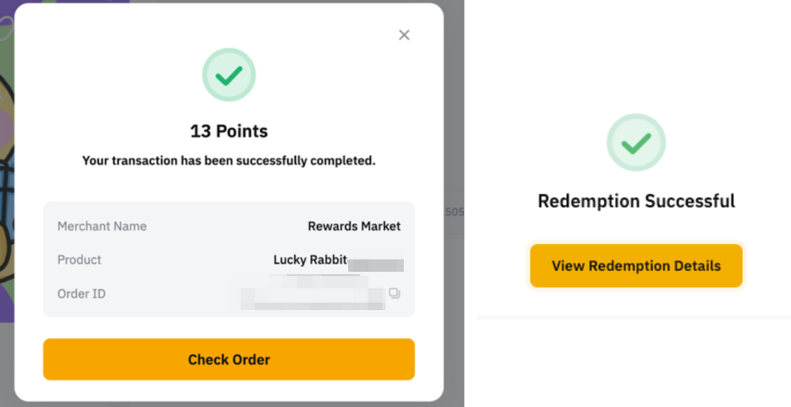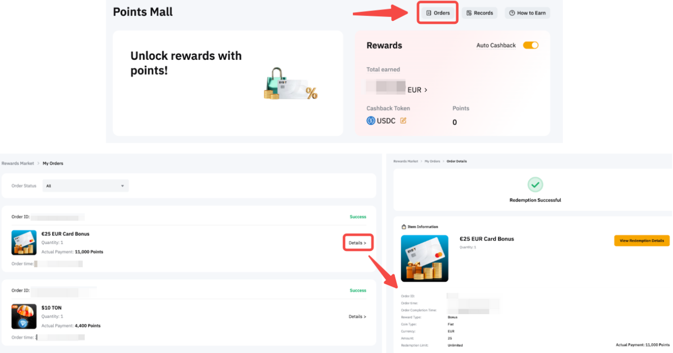 You can find your redemption status records on My Orders page. By clicking on Details, you can access all the information related to your redemption, including the order ID, creation time, completion time, coin type, currency, reward amount, and point payment amount.