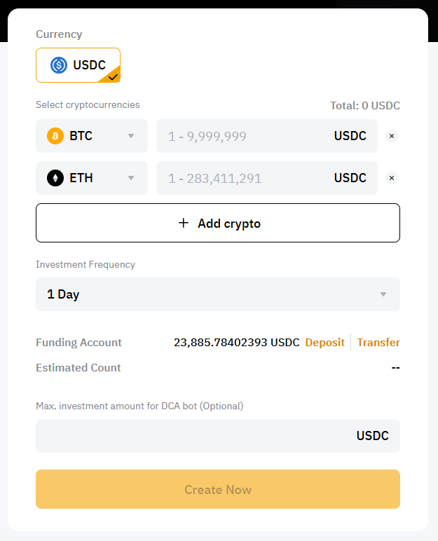 — If you do not set a Maximum Investment Amount and the available balance in your Funding Account is not enough for the next auto-purchase, you will receive an email and notification to remind you to deposit funds into your Funding Account. If you fail to deposit sufficient funds in time for the next auto-purchase, the DCA bot will be suspended. Once there are sufficient funds in the Funding Account, it will be activated again at the next auto-purchase time.