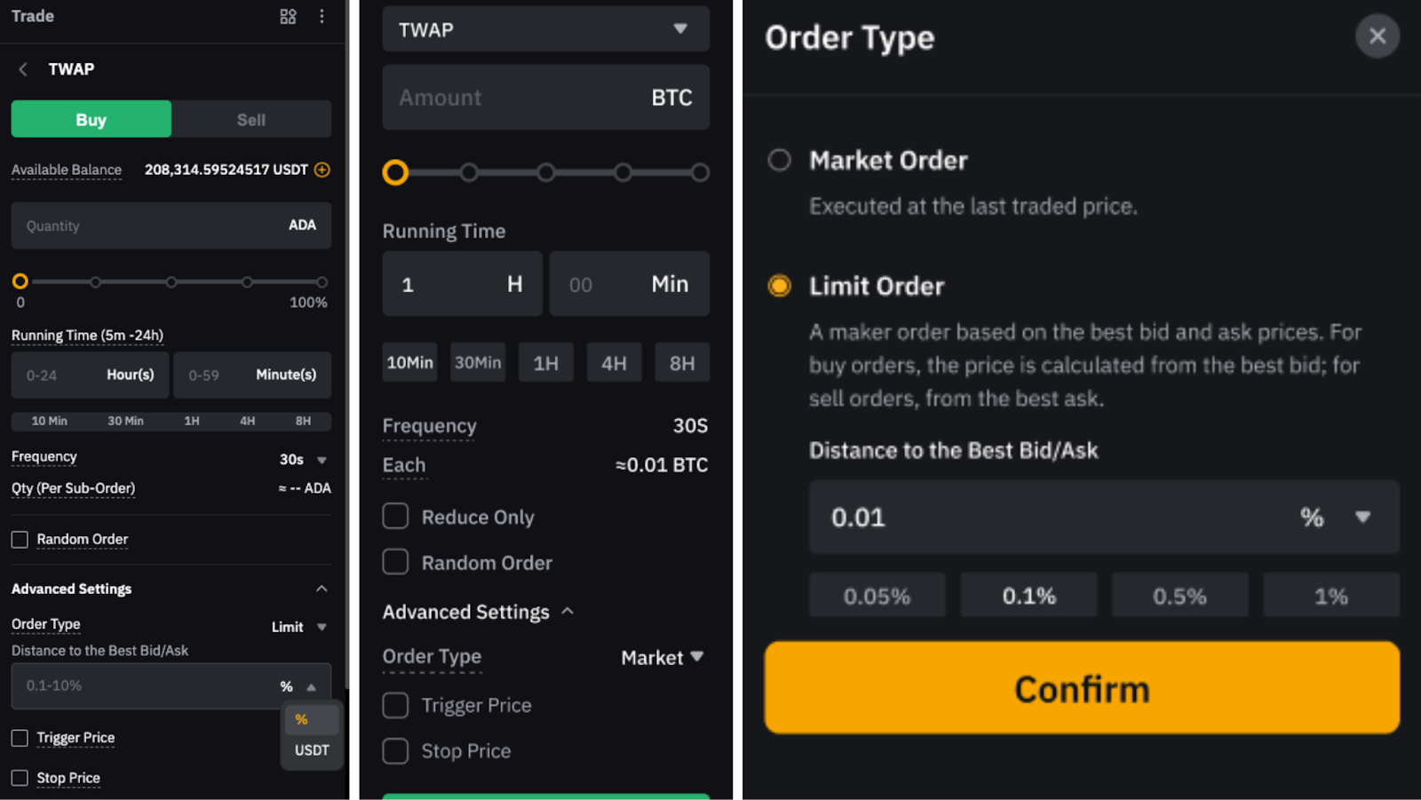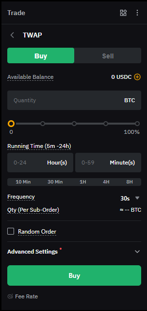 This sets how long the TWAP strategy remains active. You can choose any duration from 5 minutes to 24 hours.