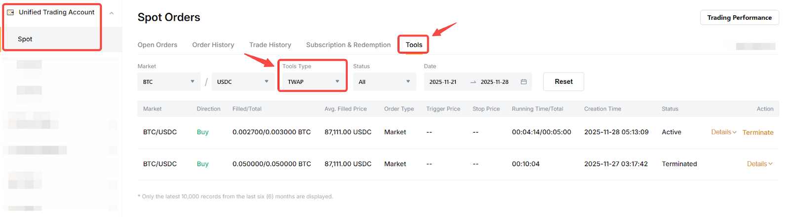 6. If an order placed by TWAP is not fully filled under exceptional circumstances, the system will try to match the orders again. If the match fails, the order will be canceled and wait for the next order placement until the TWAP strategy is terminated or ended.