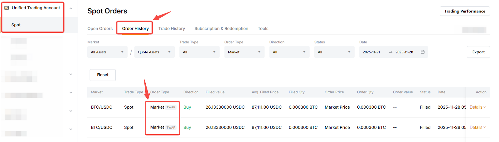 Order History shows orders placed using your TWAP strategy which can be identified via the TWAP label under Order Type.