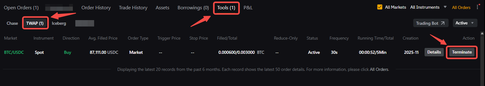 In the position tab, Click on Tools, and then select TWAP. You’ll be able to view the details of the strategy, including Filled Size/Total, Avg. Filled Price, Price Limit and more. Click on Terminate to terminate your TWAP strategy.