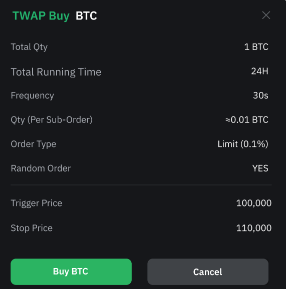 4. For Spot Trading, the maximum order size for each suborder placed via the TWAP strategy can be found here.