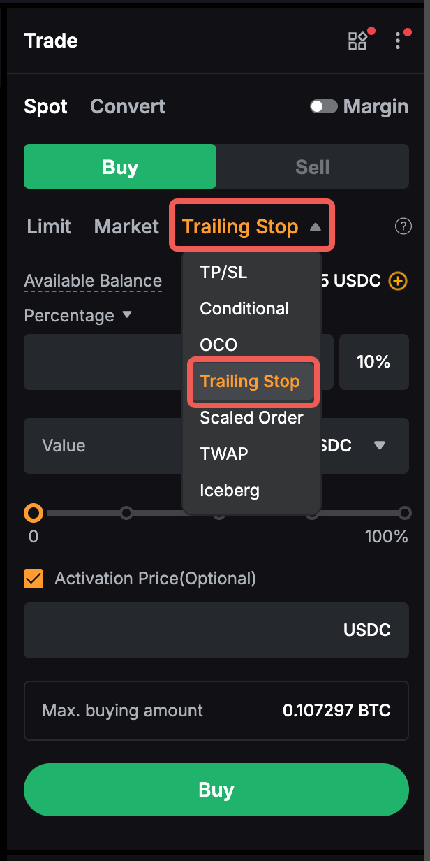 Step 1: Go to the Spot Trading page and select Trailing Stop order.