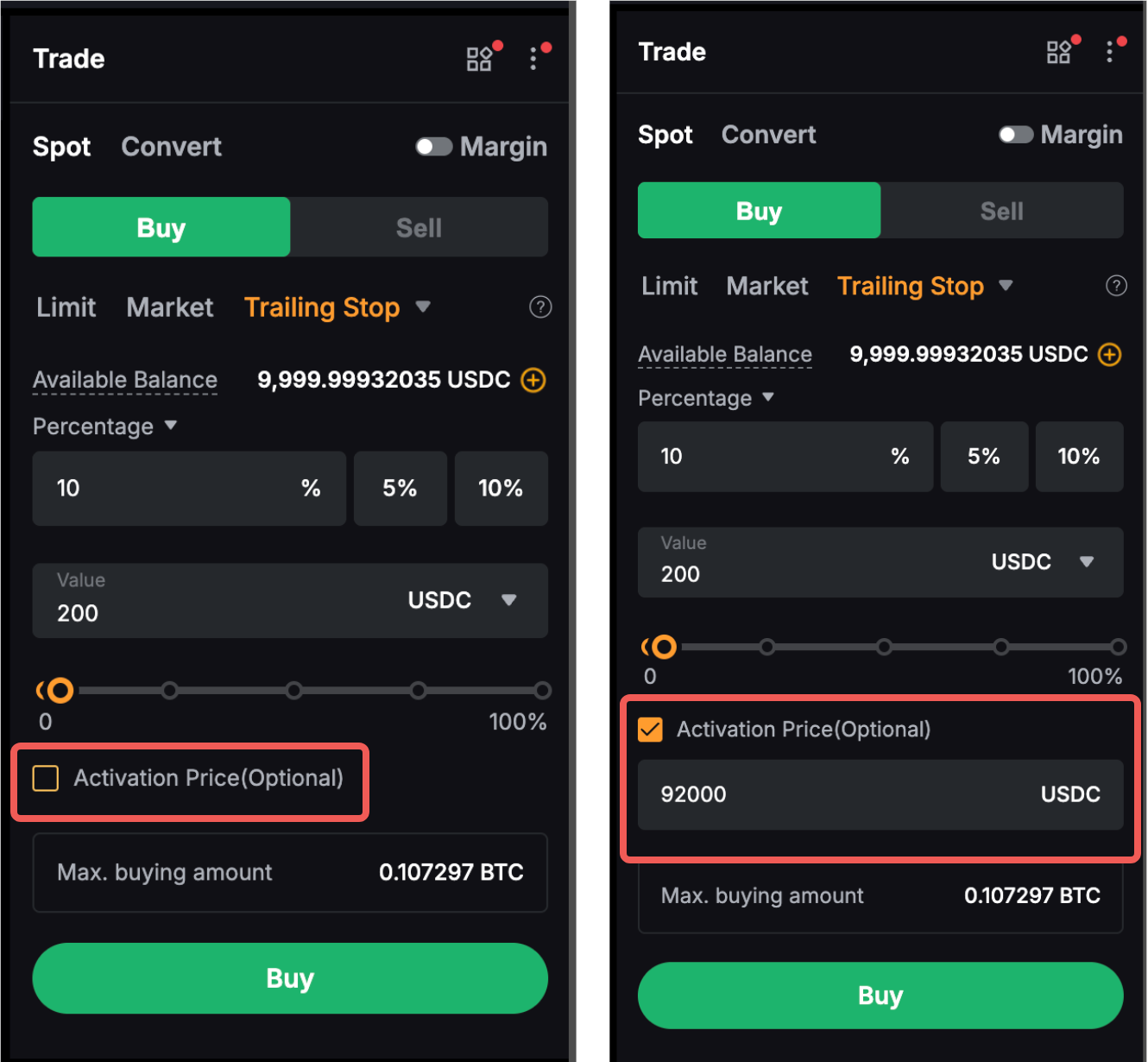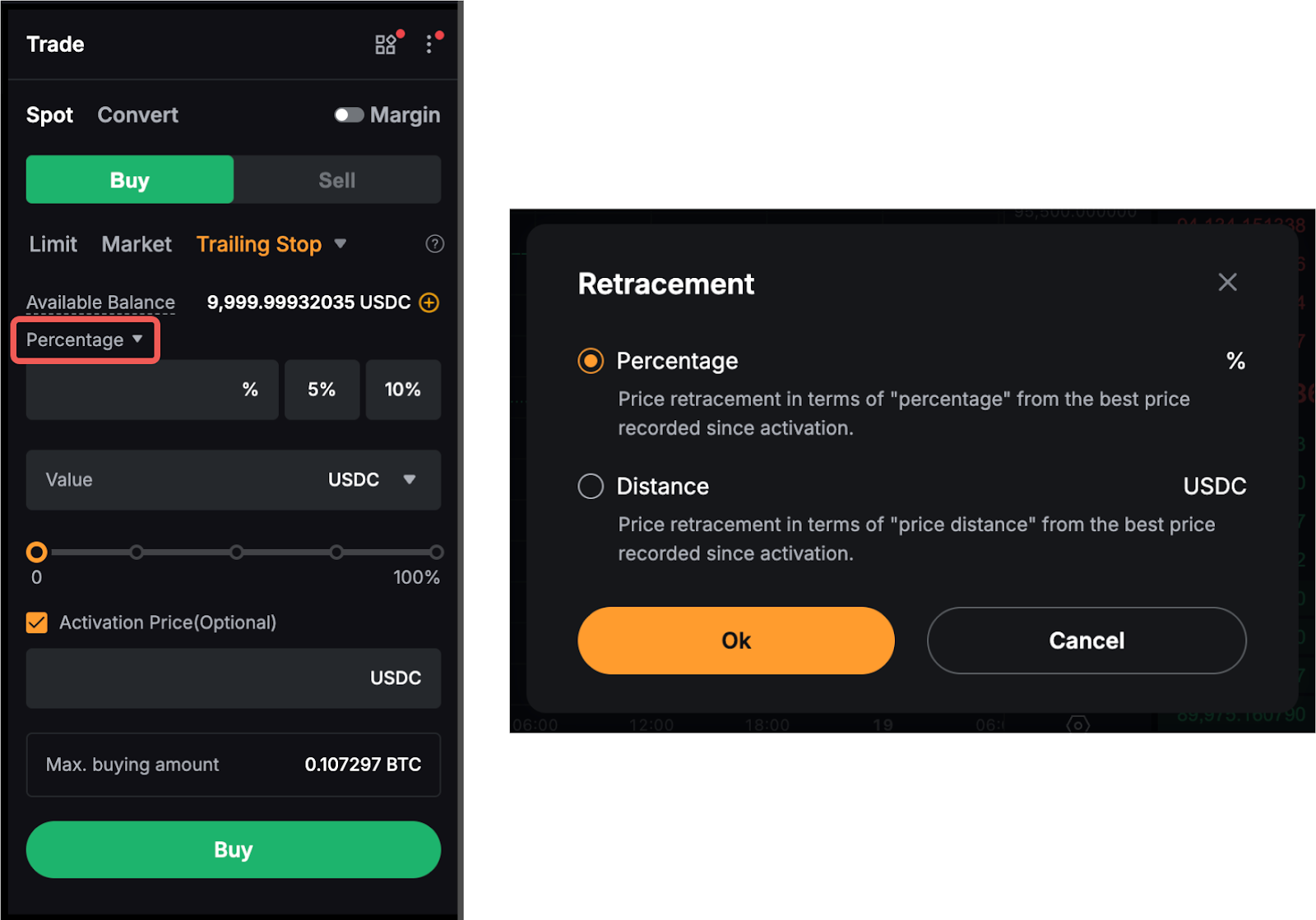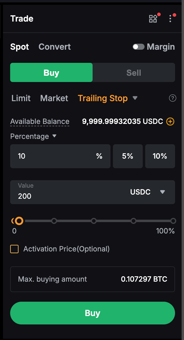 The Trailing Stop order functions similarly for Spot and Spot Margin trading, and it can be utilized for both Buy and Sell orders.