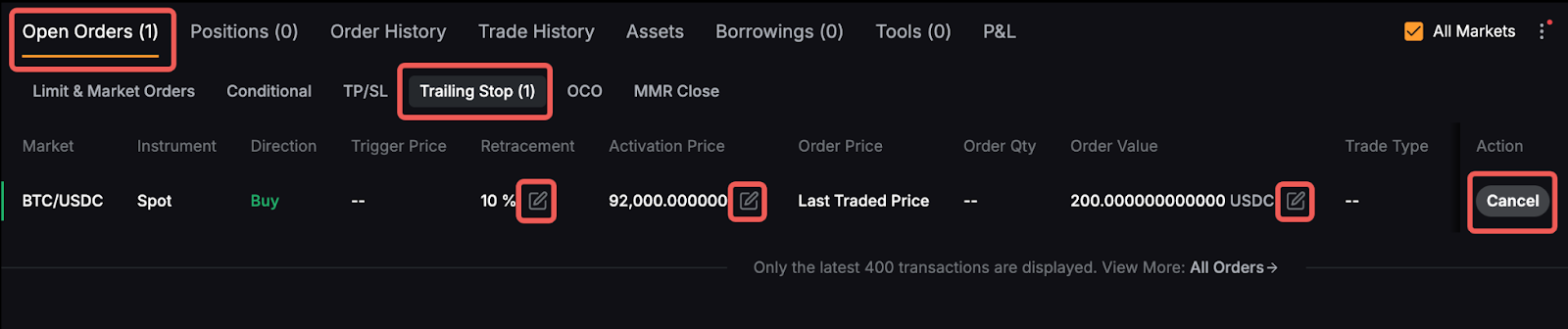 To view your current Trailing Orders, go to the Open Orders → Trailing Stop tab.