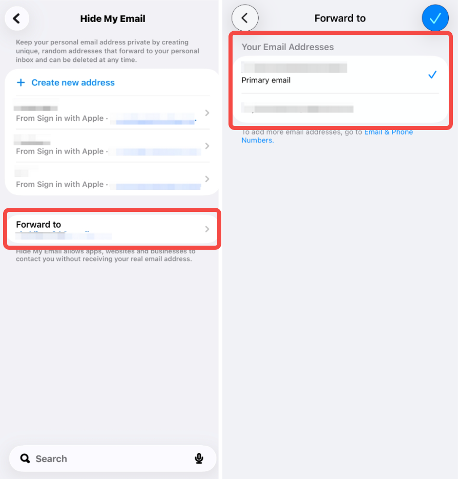 Tik vervolgens op Stuur door naar en selecteer het persoonlijke e-mailaccount dat je hebt gekozen bij het aanmaken van dat door Apple gegenereerde e-mailadres.