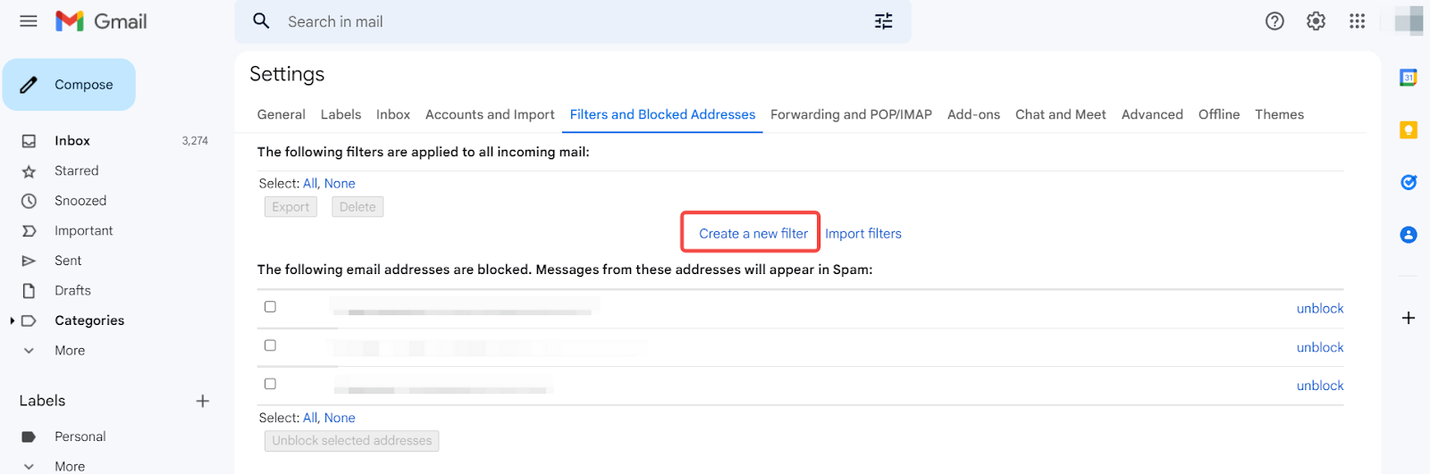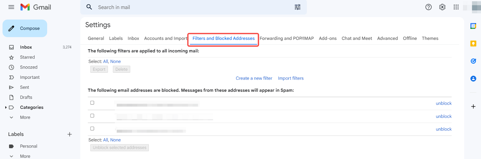 Stap 1: Klik op de instellingen van je Gmail account en selecteer Filters en geblokkeerde adressen.