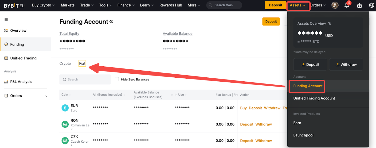 Klik op Activa → financieringsaccount om jouw gekochte fiat-valuta te bekijken onder Fiat.