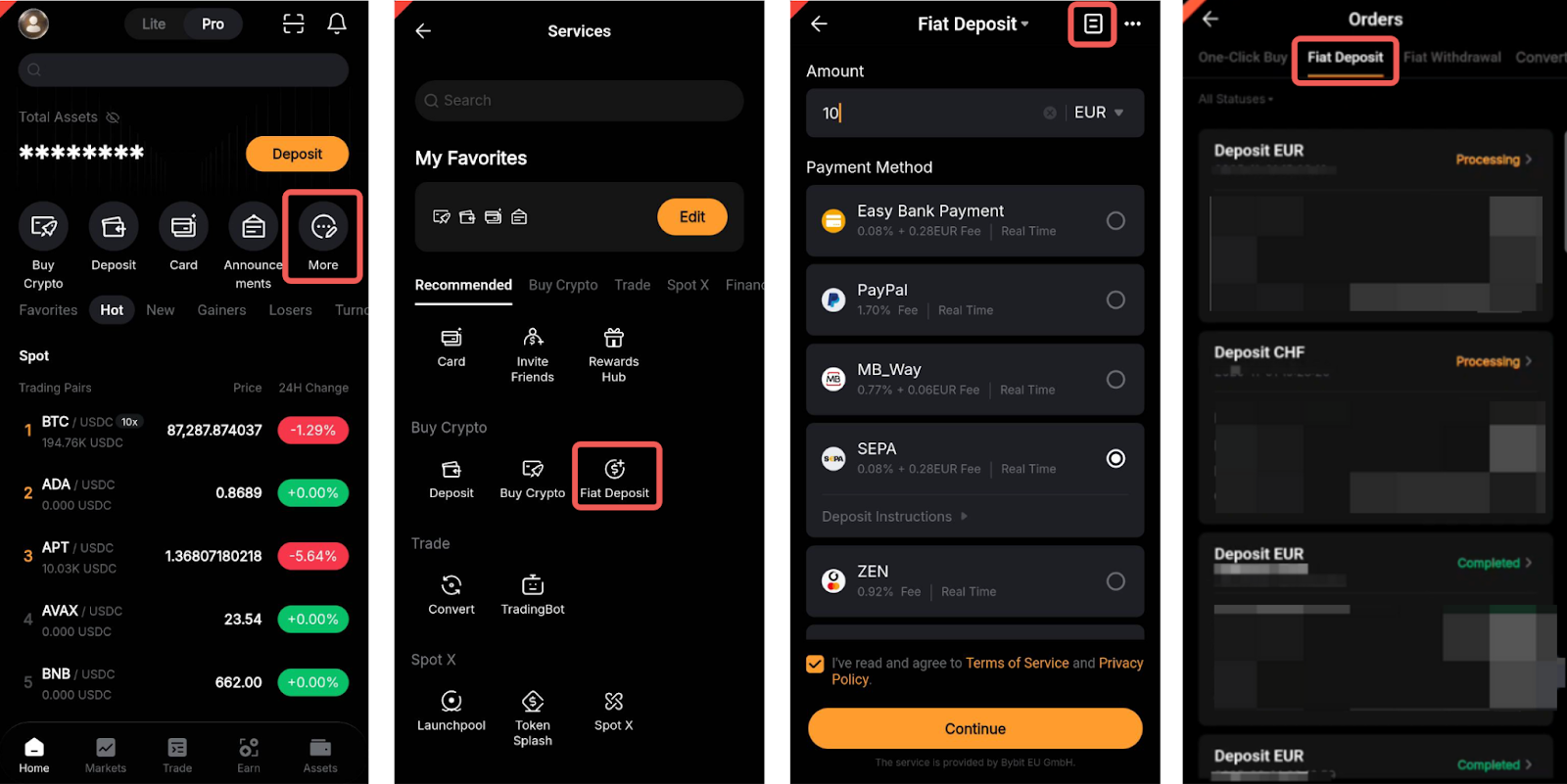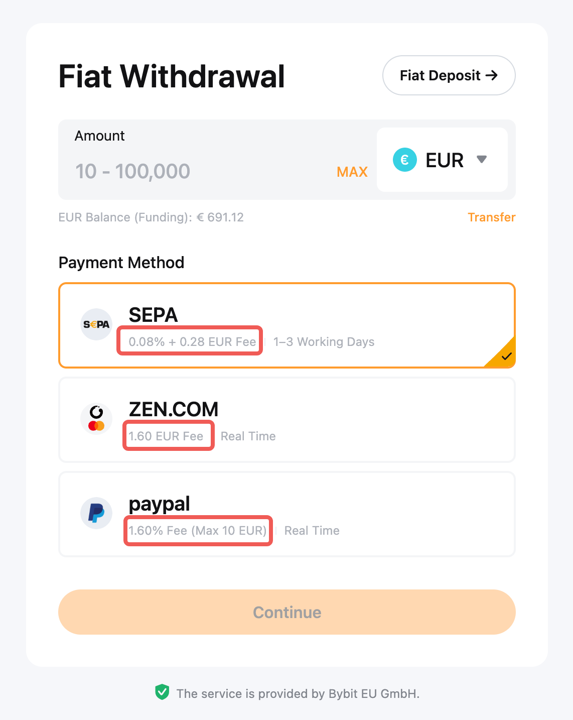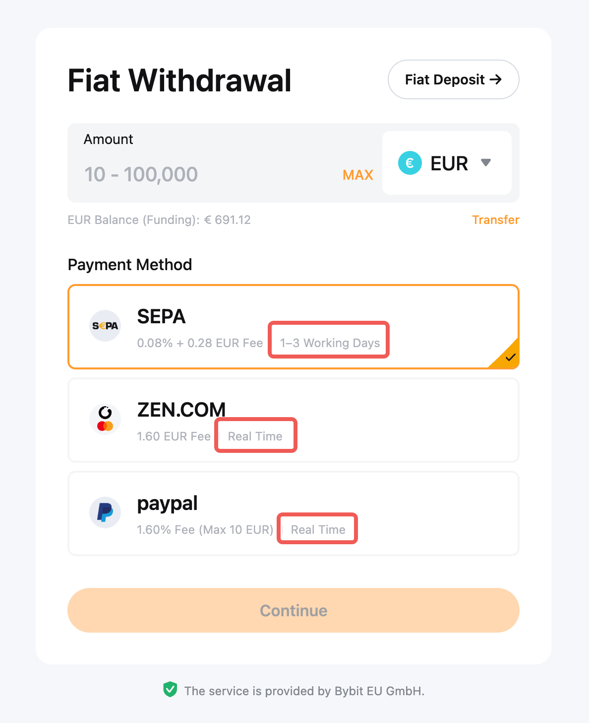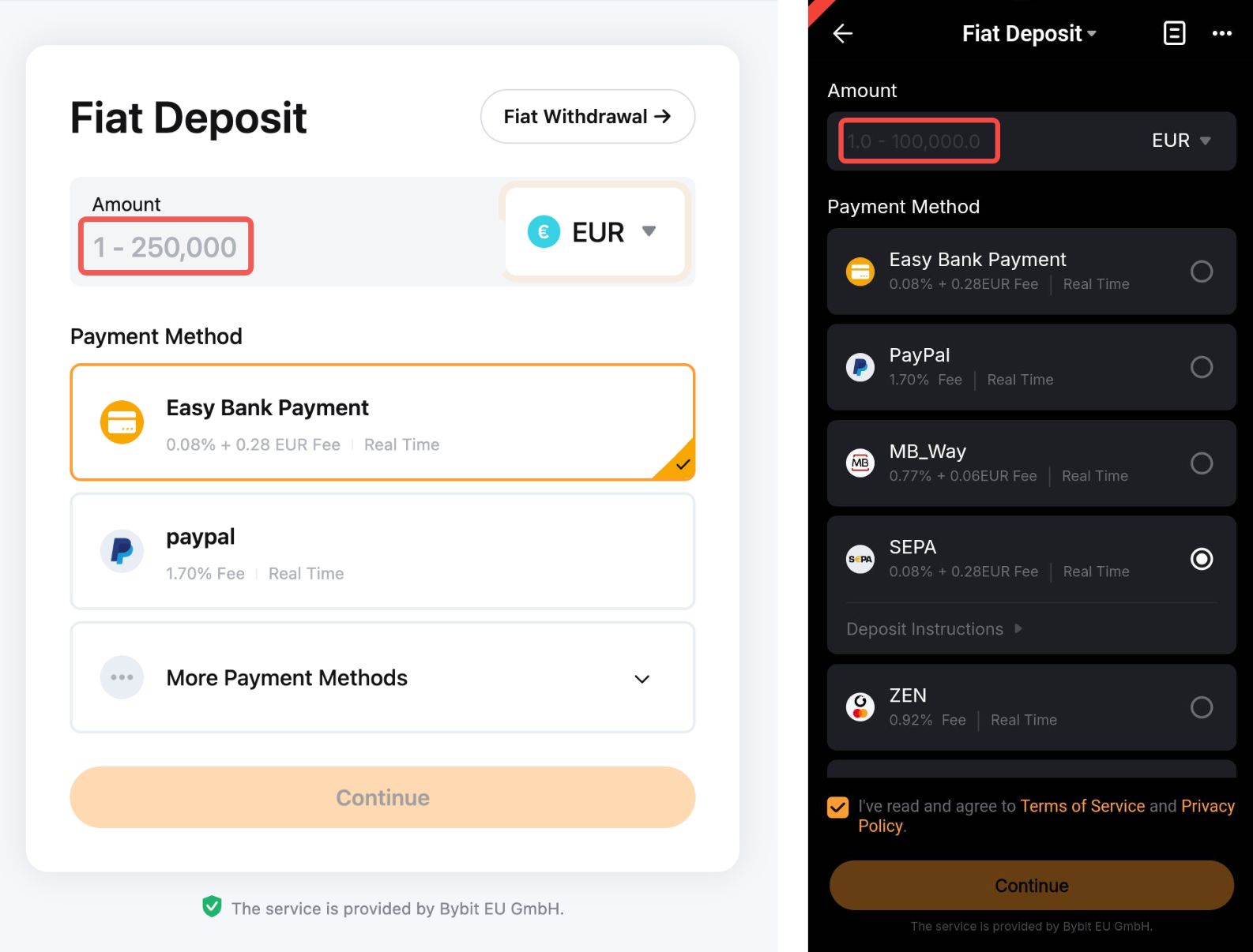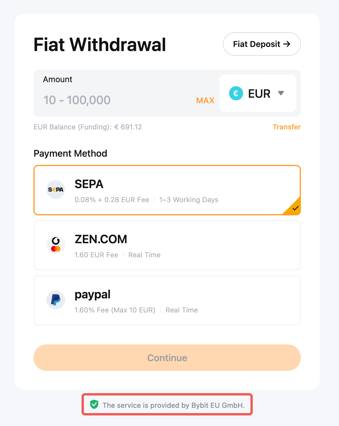 Met een fiat-storting kun je fiat-valuta overmaken naar jouw Bybit EU financieringsaccount. Daarna kun je op elk gewenst moment coins kopen met het fiat-saldo op die rekening. Bezoek deze pagina om meer te leren over andere betaalmethoden.