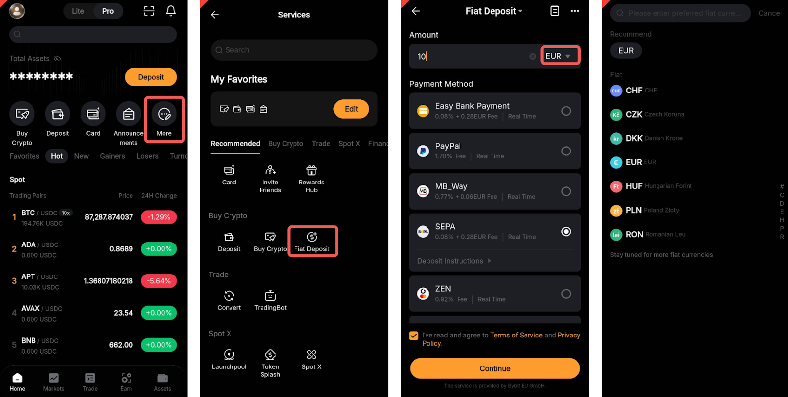 Ga in de app naar de startpagina en tik op Meer (More). Selecteer vervolgens Geldstorting (Fiat Deposit). Tik op de fiat-valuta om de lijst met ondersteunde opties te openen.