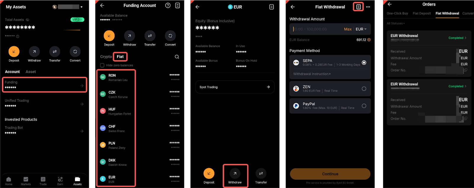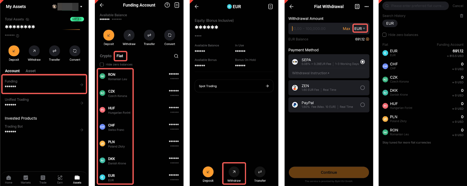 - Gebruik betaalmethoden met dezelfde naam als uw Bybit EU KYC. Het gebruik van rekeningen van iemand anders voor betalingsoverdrachten is ten strengste verboden.