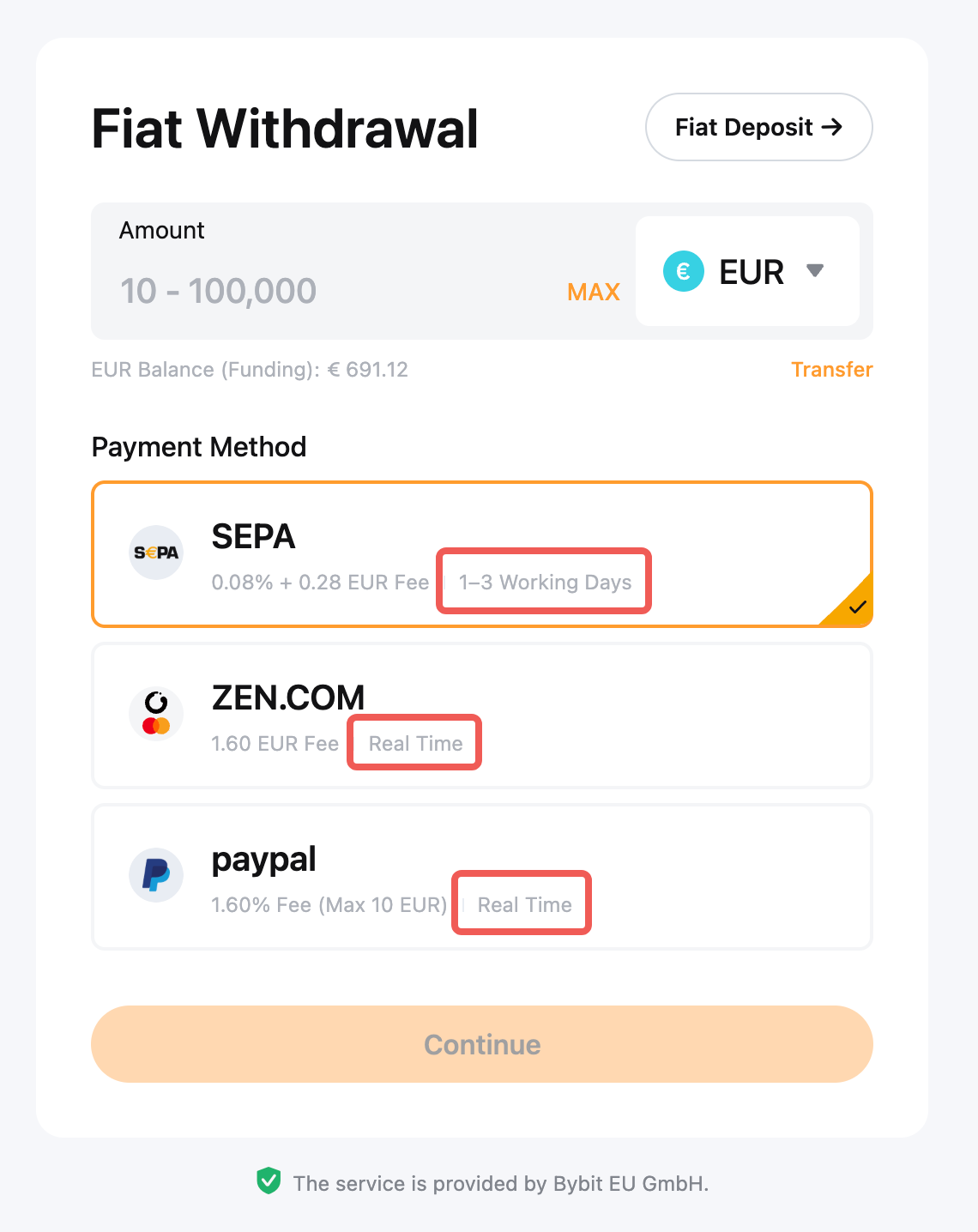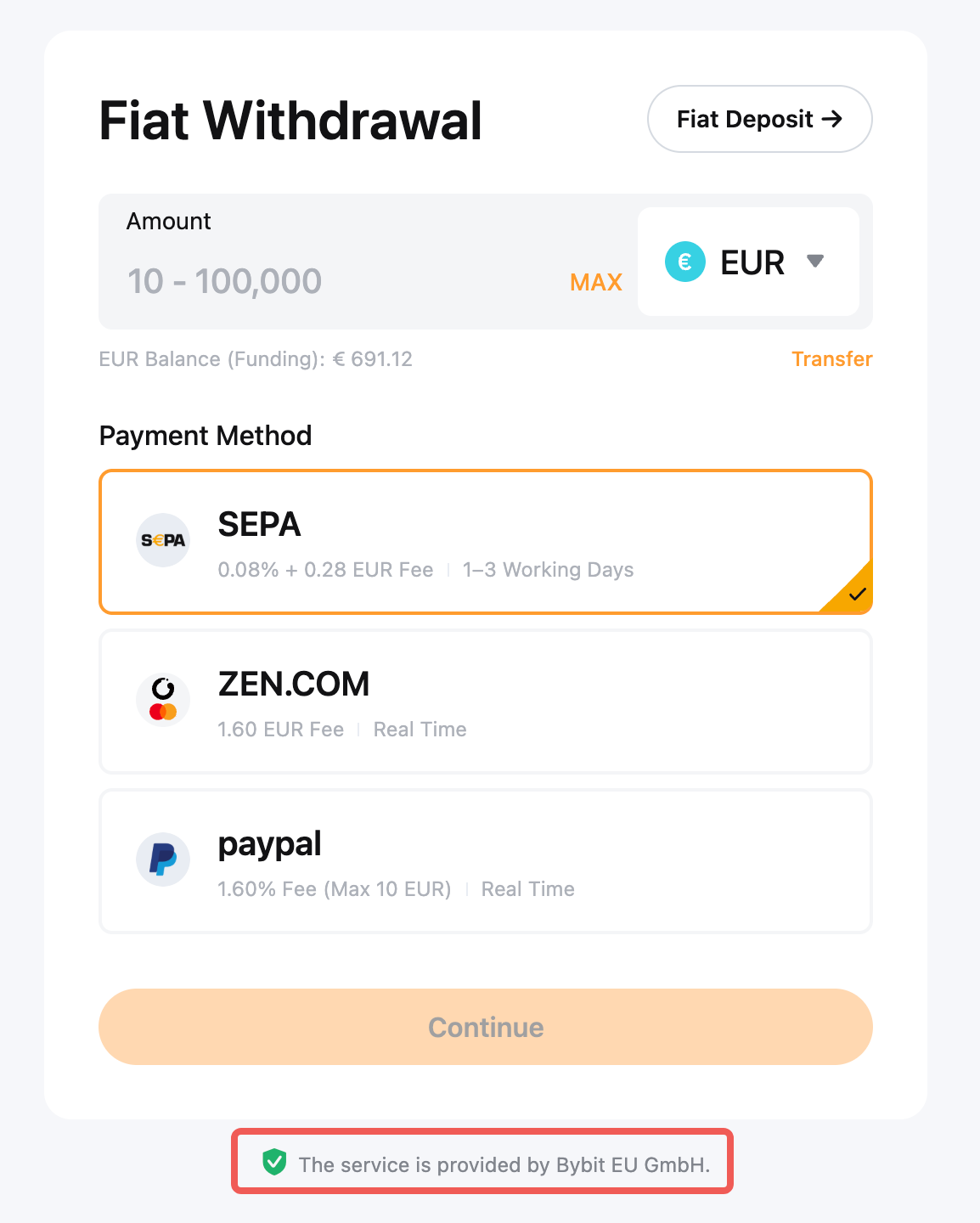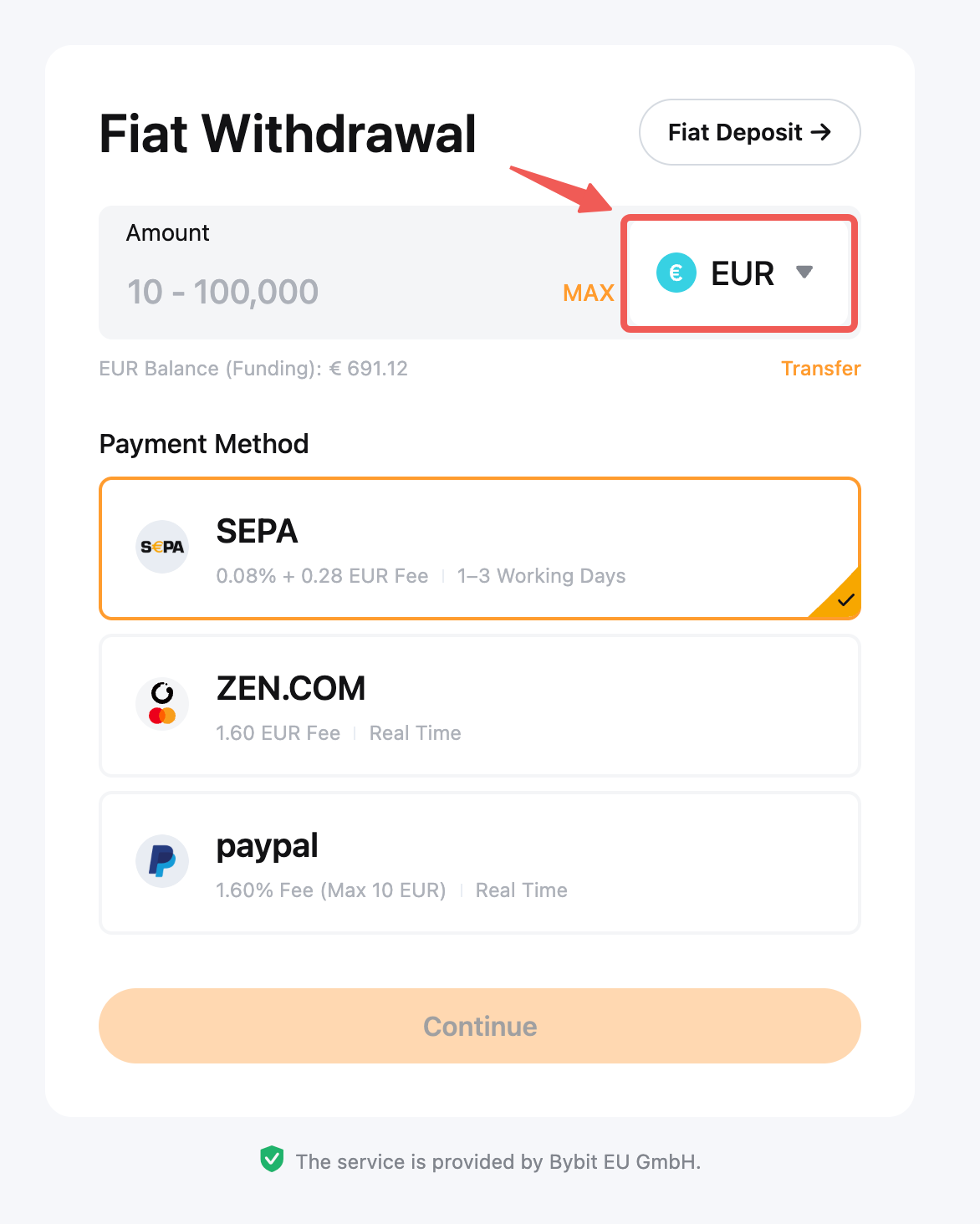 Er is slechts een beperkt aantal fiduciaire valuta's beschikbaar voor opname op Bybit EU. Je kunt de fiduciaire valuta's die worden ondersteund voor fiduciair opnemen zien op de pagina Fiduciair opnemen.
