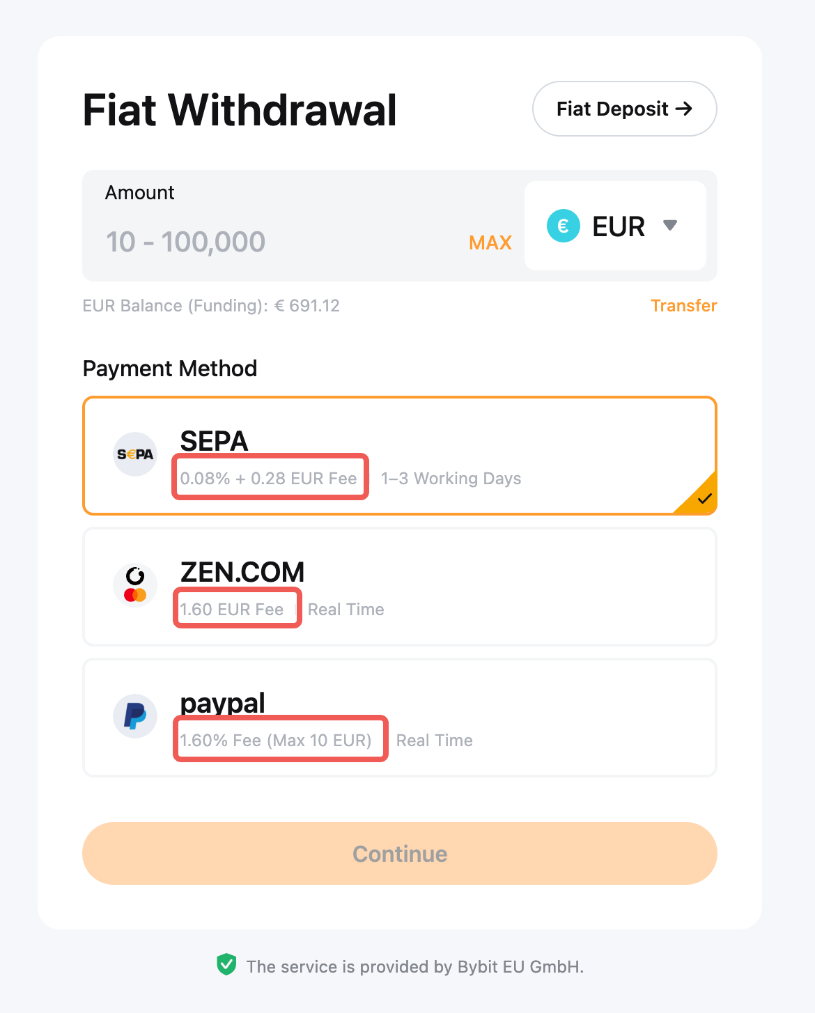 Er kunnen kosten verbonden zijn aan uw fiatopname, afhankelijk van de geselecteerde fiatvaluta en betaalmethode. U vindt de relevante tarieftarieven die voor elke fiduciaire valuta en betaalmethode worden toegepast door naar de pagina Fiduciair opnemen te gaan en de fiduciaire valuta van uw keuze te selecteren.
