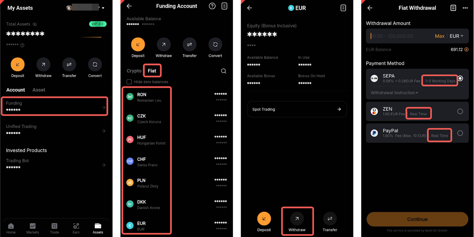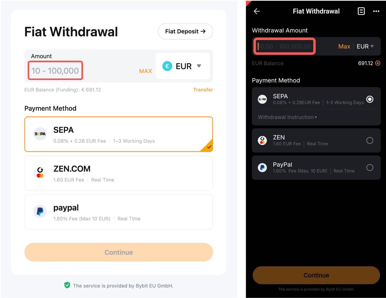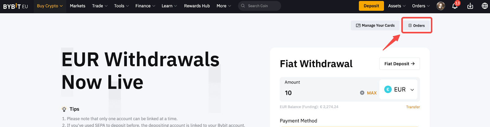 - Om op te nemen met e-wallet, moet je een eerste fiduciaire storting doen via de respectievelijke betaalmethode om je bankrekening toe te voegen voor storting en opname op je Bybit EU-rekening.