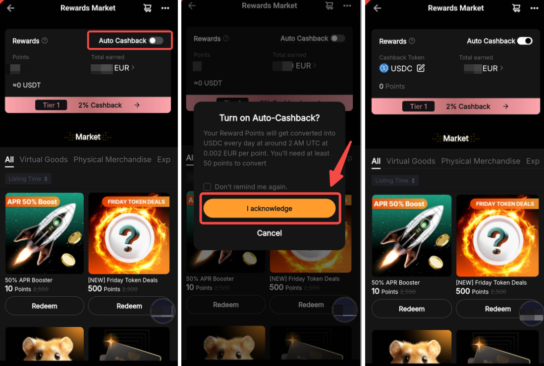 Hier is een stap-voor-stap handleiding voor het activeren van Auto Cashback met Rewards Points van je Bybit Card en het bekijken van je eerdere inwisselrecords.