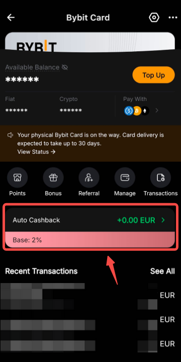 Stap 4: Nadat Auto Cashback met succes is geactiveerd, zie je dat de Bybit Reward Points zijn ingeschakeld voor Auto Cashback op het Bybit Card Dashboard. De punten worden elke dag rond 2 uur 's ochtends omgezet in de gekozen token en bijgeschreven op je financieringsaccount.