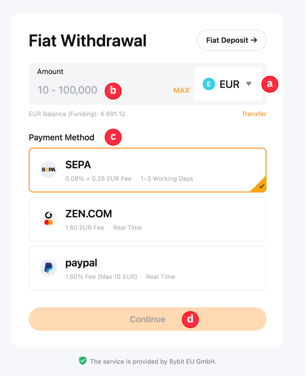 Bybit EU ondersteunt het opnemen van verschillende fiduciaire valuta's via verschillende betaalmethoden. Voordat u verdergaat met een fiduciaire terugtrekking, moet u rekening houden met het volgende: