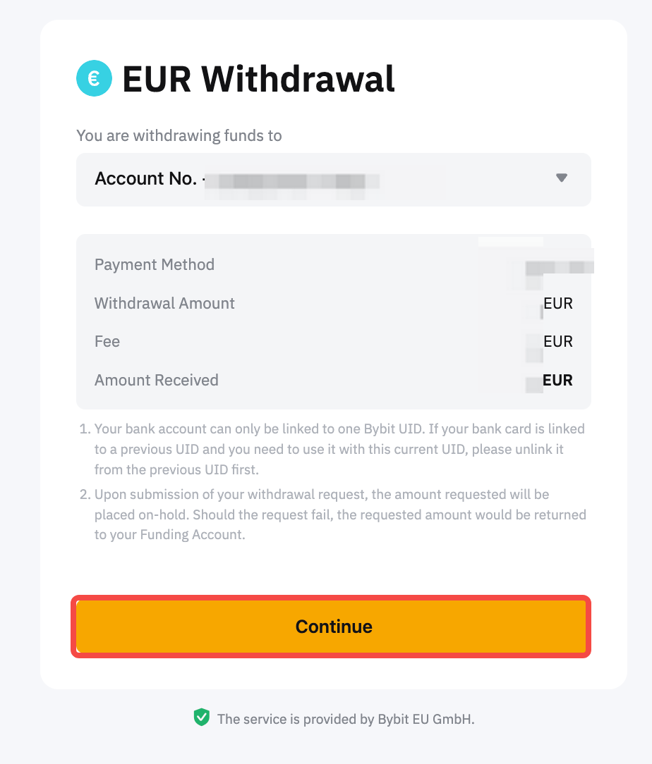 — Zorg ervoor dat de naam op je opnamerekening overeenkomt met de naam die je hebt opgegeven voor individuele verificatie op Bybit EU. Anders kan de intrekking mogelijk niet met succes worden verwerkt.