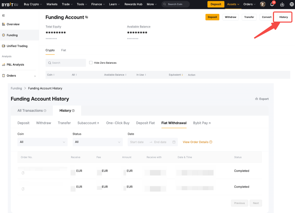 U kunt het ook bekijken vanuit Financieringsrekening → Geschiedenis → Fiatterugtrekking, of via deze link.