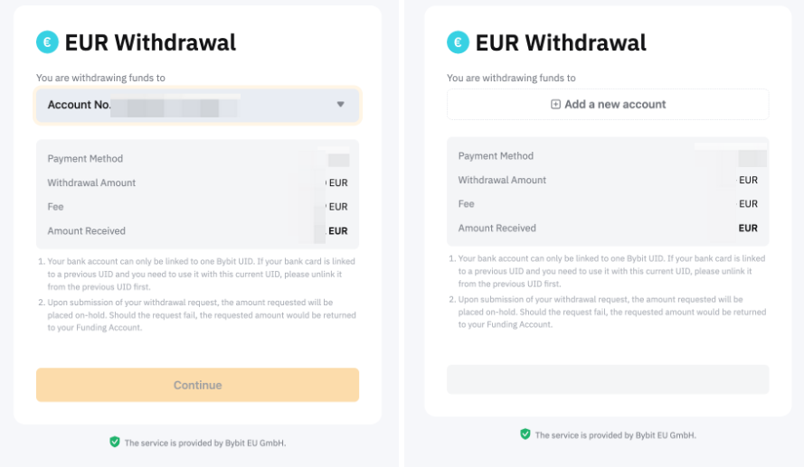 Stap 3: Als je eerder fiduciaire valuta's op je rekening hebt gestort, zal Bybit EU deze rekening automatisch koppelen voor opname.