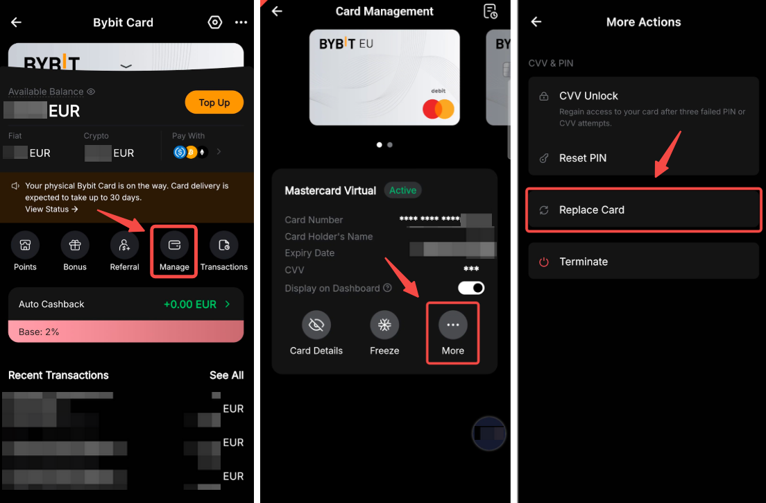 Tik dan op Card op de pagina Bybit Card Management. Tik vervolgens op Meer onder Fysieke kaart en selecteer Kaart vervangen.