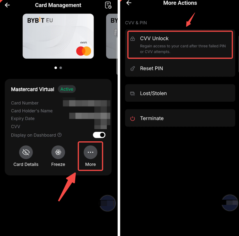 Als je het aantal pogingen om je CVV in te voeren hebt overschreden, wordt je kaart geblokkeerd. Je kunt je CVV deblokkeren op de pagina Kaartbeheer. Klik op Meer, tik op CVV Deblokkeren en verifieer met beveiligingsverificatie.