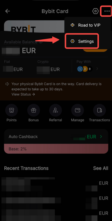 Stap 1: Ga naar Bybit Card, tik op de drie puntjes en tik op Instellingen.