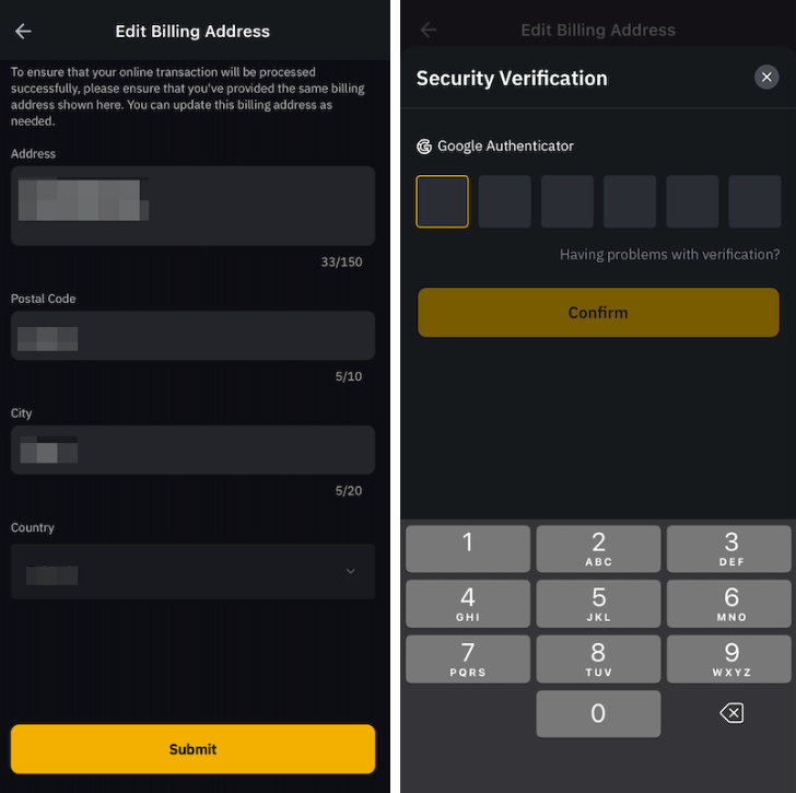 Stap 3: Vul je bijgewerkte factuuradres in, klik dan op Submit en voer de Google Authenticator-code in om je actie te bevestigen.