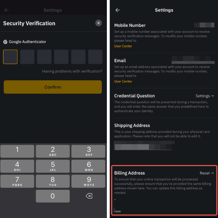 Stap 2: Klik na het verifiëren van je account met 2FA op Reset onder Factuuradres.