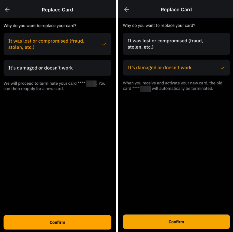 Selecteer deze optie als je Bybit Card in gevaar is gebracht. Na bevestiging van de optie wordt je fysieke kaart beëindigd en kun je een nieuwe kaart aanvragen.