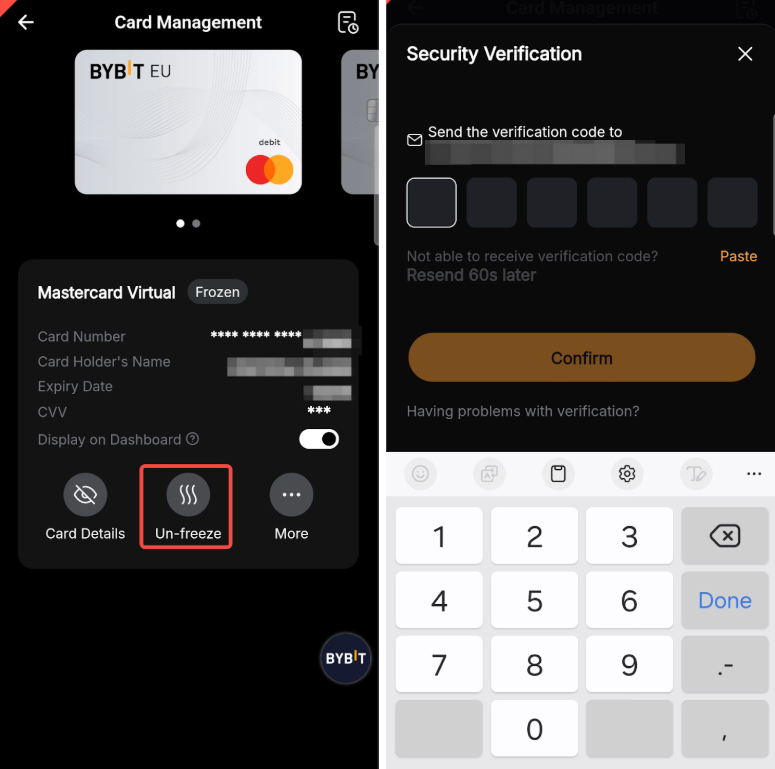 Om je Bybit Card opnieuw te activeren, tik je op Unfreeze en voltooi je de beveiligingsverificatie om de actie te bevestigen.