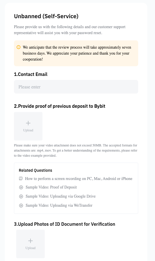 However, if any suspicious activity is detected, you will be redirected to a Self-Service Unban page. There, you will need to follow the steps below to submit certain documents for review.