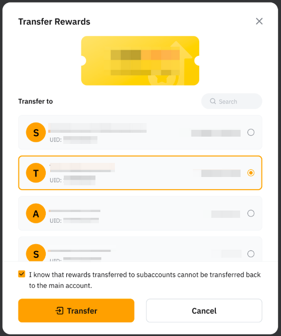 — Once the rewards are transferred to your Subaccount, they cannot be transferred back to the Main Account or to other Subaccounts. Ensure you select the correct reward and Subaccount before confirming the transfer.