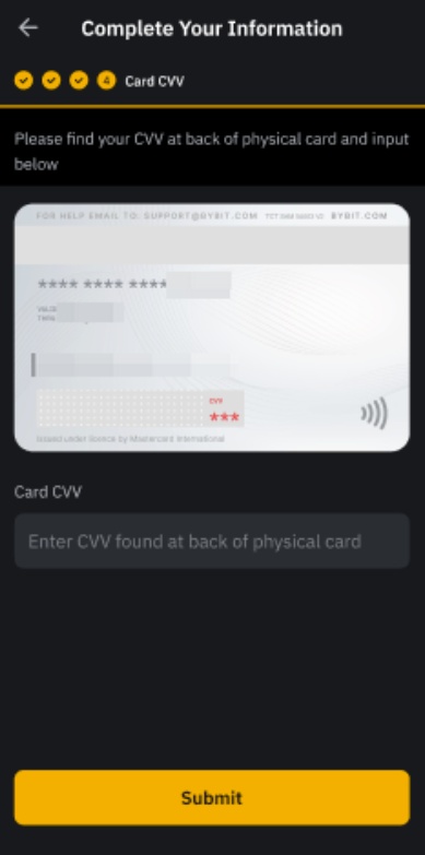 3o passo: Insira o CVV de 3 dígitos no verso do seu Cartão Bybit físico e toque em Enviar. Se você ainda não forneceu seu número de celular, perguntas de segurança e endereço de cobrança, insira as informações antes de inserir o CVV.