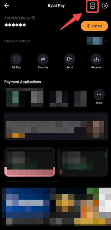 Para ver seu histórico de pagamentos, por favor vá para a página da Bybit Pay e clique no ícone de Papel no canto superior direito.
