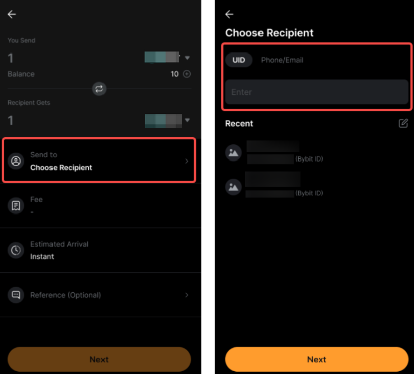 Passo 3: Toque em Escolher Destinatário e insira o UID do destinatário, número de telefone ou endereço de e-mail. Você também pode selecionar um destinatário das suas transações recentes. Toque em Próximo para continuar.