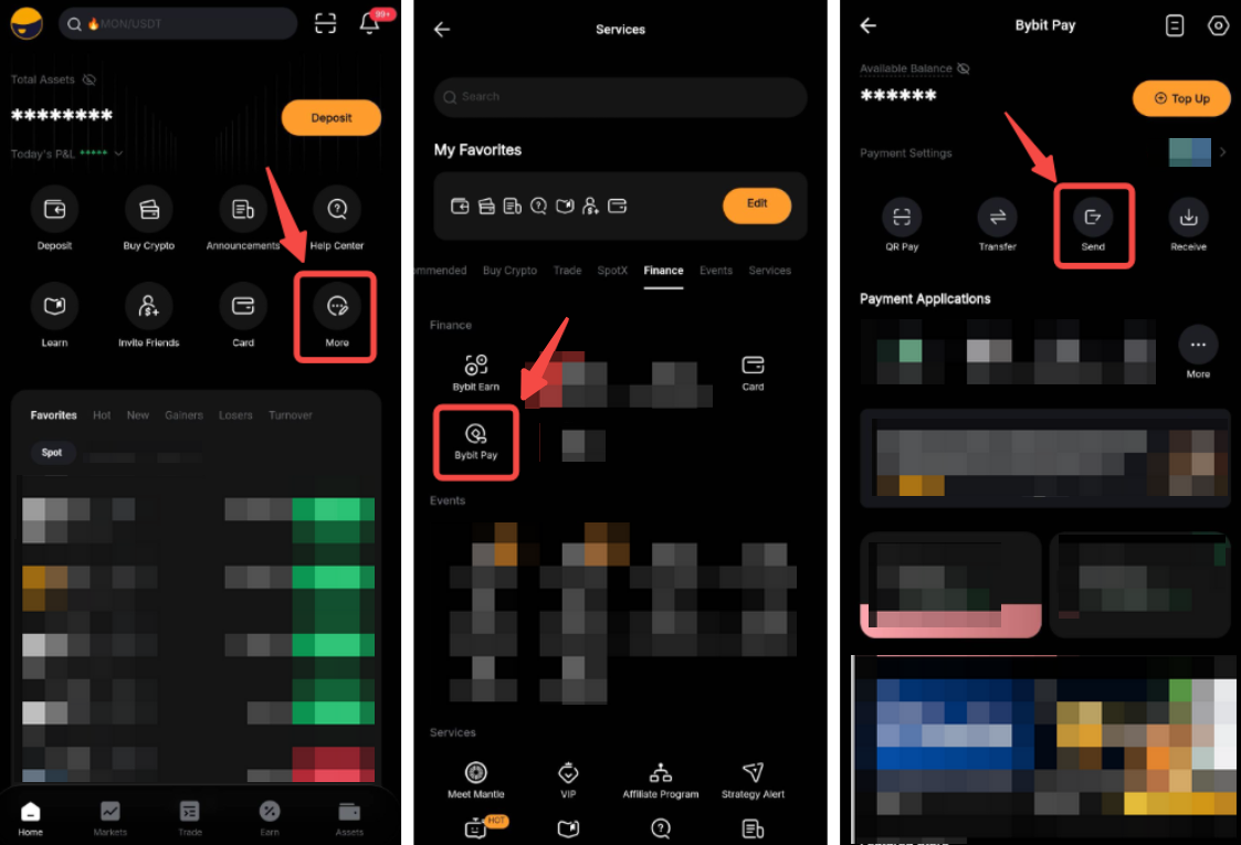 Passo 1: Na página inicial do Bybit EU, vá para a página Bybit Pay clicando em Mais → Bybit Pay e toque em Enviar.