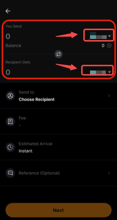 Passo 2: Selecione os ativos para enviar e receber tocando nos Nomes dos ativos e insira o valor que deseja enviar. A lista completa de ativos de Cripto e Fiat suportados será exibida em uma nova página.
