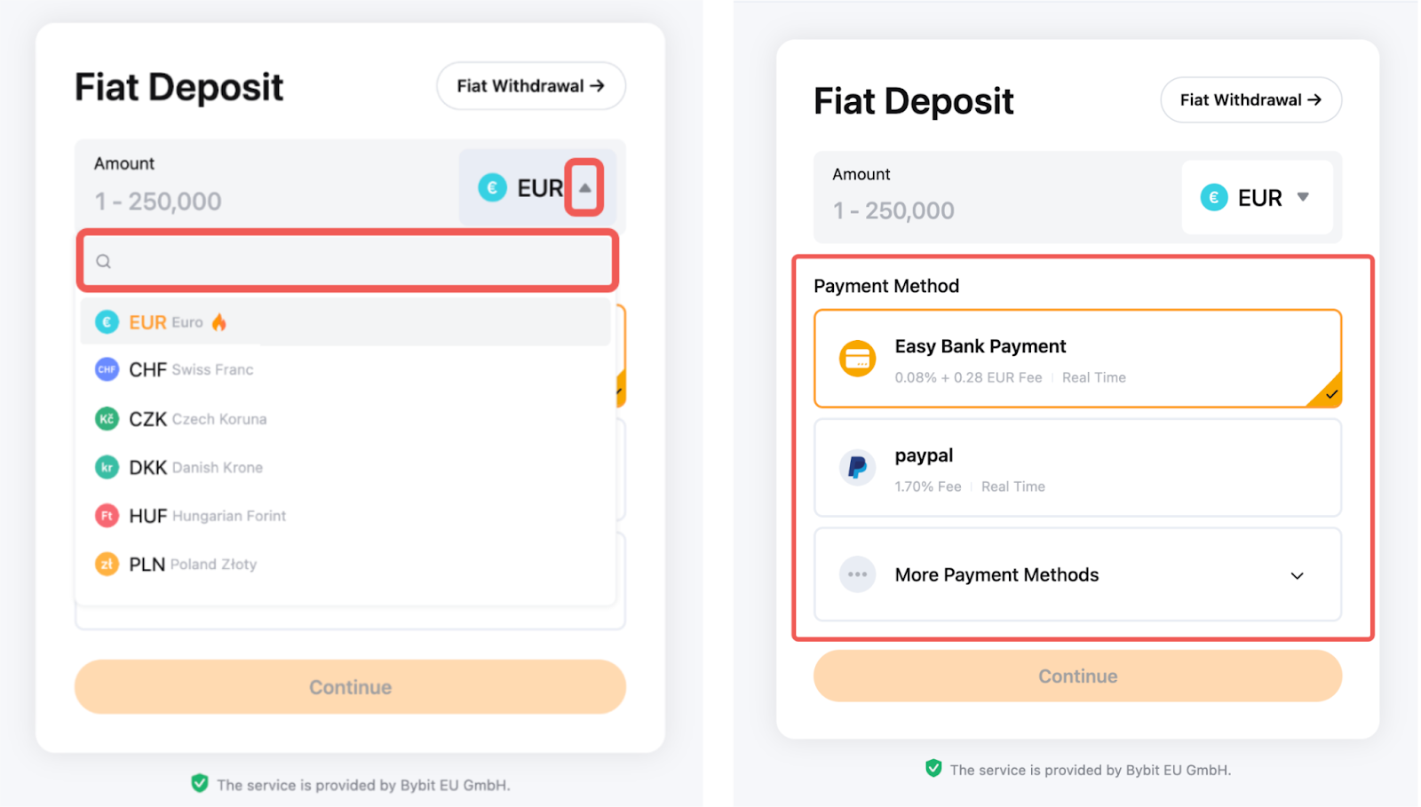 Bybit EU susține depunerea diverselor monede fiduciare și oferă mai multe metode de plată. Înainte de a continua cu depunerea unui depozit finit, vă rugăm să rețineți următoarele: