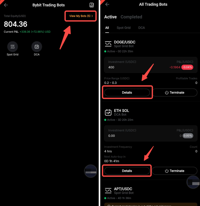 You can click on Details in the upper right corner of the grid bot you wish to view to explore more information, including the current status of your Spot Grid Bot, current orders under the Holdings tab, and your order history.