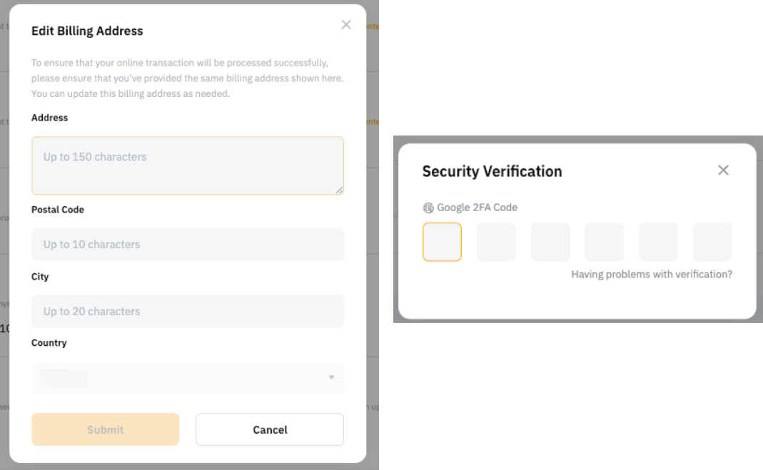 Step 3: Fill up your updated billing address, then click on Submit and enter the Google Authenticator code to confirm your action.