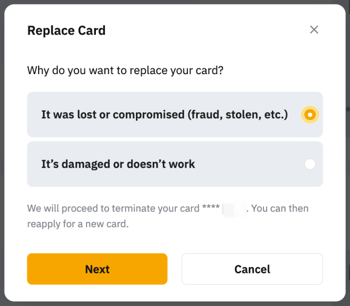 Select this option when your Bybit Card has been compromised. Upon confirming the option, your physical Card will be terminated and you can apply for a new card.
