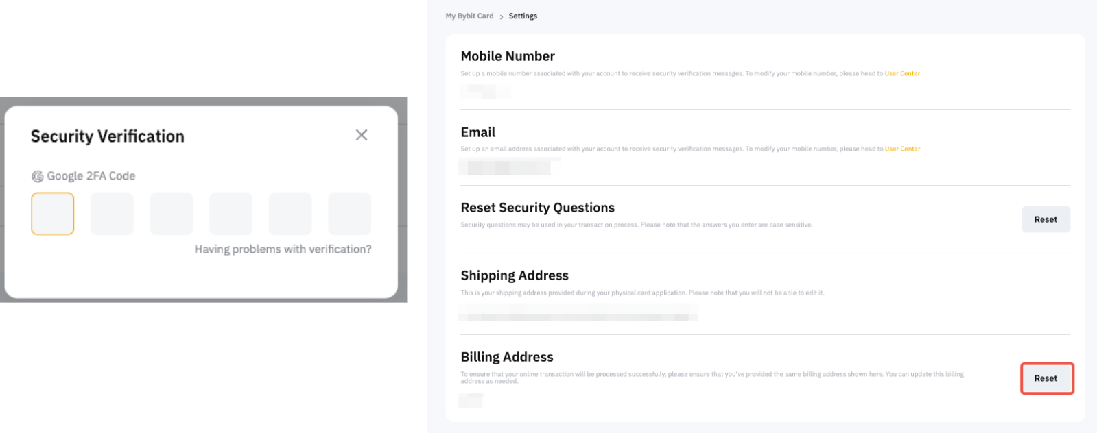 Step 2: After verifying your account with 2FA, click on Reset under Billing Address.